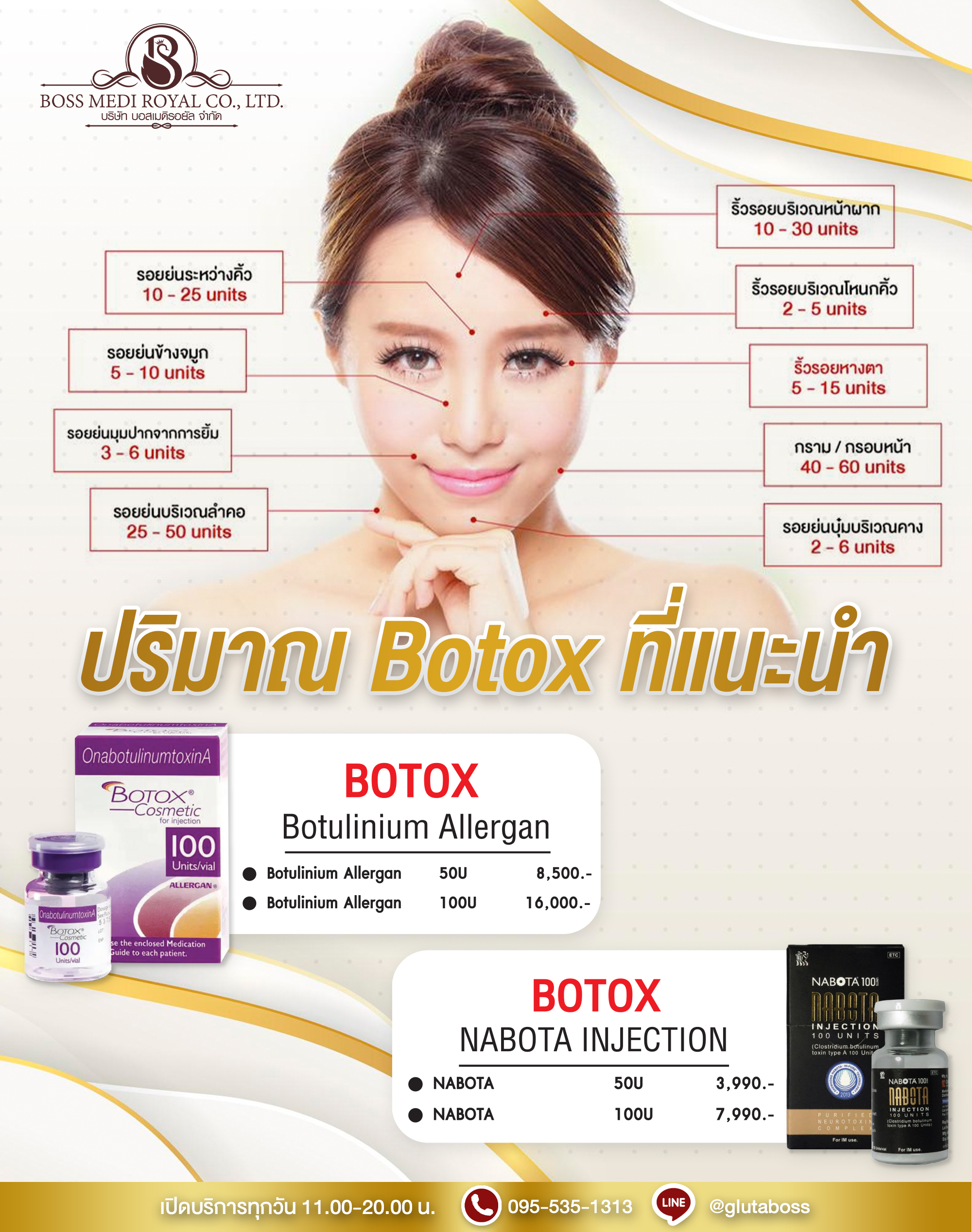 - ตัวกล่องโบท็อก Allergan 100 units จะเป็นสีขาว – ม่วง ส่วน Allergan 50 units จะเป็นสีขาว – แดง